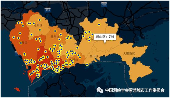 显示的是深圳各个行政区发病人员数量的分层设色图以及发病小区点。其中发病人员数量越多颜色越深,并与左下角图例相呼应,点击地图的深圳行政区或者小区点,会显示发病人数统计数据信息。