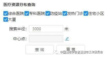 点击左上角的“医疗资源分布”,会进入医疗分布资源查询界面,此时可以通过该界面右侧的操作面板,选择需要查询的医疗资源和缓冲中心点,输入缓冲半径,进行医疗资源分布的查询。