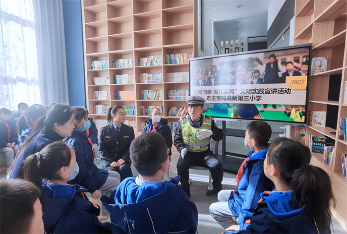 11月28日,在宝鸡高新第三小学开展“崇德向善 周礼宝鸡“文明实践”进学校”宣讲活动,正在进行“文明交通”主题宣讲。