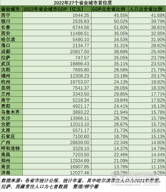 从人口首位度看,2022年西宁、银川、长春、西安、哈尔滨、海口、成都、拉萨、武汉、沈阳分别位居前十名,以20%这一分界线看,27个省会城市中,共有11个城市人口首位度高于20%。