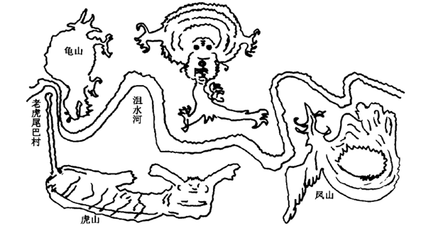 “桥山巨龙”的龙尾起自石山村的龙尾湾,龙脊于桥山半腰呈波浪状,七沟八梁忽隐忽现向上直至黄帝陵后,自西往东盘绕六周,凌空陡起数十丈而成峰,海拔1021米,即“盘龙岗”。而黄帝陵北有五谷六峰,南有七沟八梁,其地理位置巧处龙舌的中心,恰似龙口所含珍珠。……南山整体,如卧虎伏身,……有一山脊呈虎尾状,……黄帝陵东有凤凰山,此山似凤。……凤嘴处,有一土丘长满古柏,颇似凤之冠。其尾弯曲延伸十余公里,迤拖于刘家川山。……西有玉仙山,其形犹似万年龟,回首翘望盘龙岗。山前土丘如龟头伸出,其山顶呈扁圆状,似龟背隆起,龟纹、龟爪亦清晰可辫。