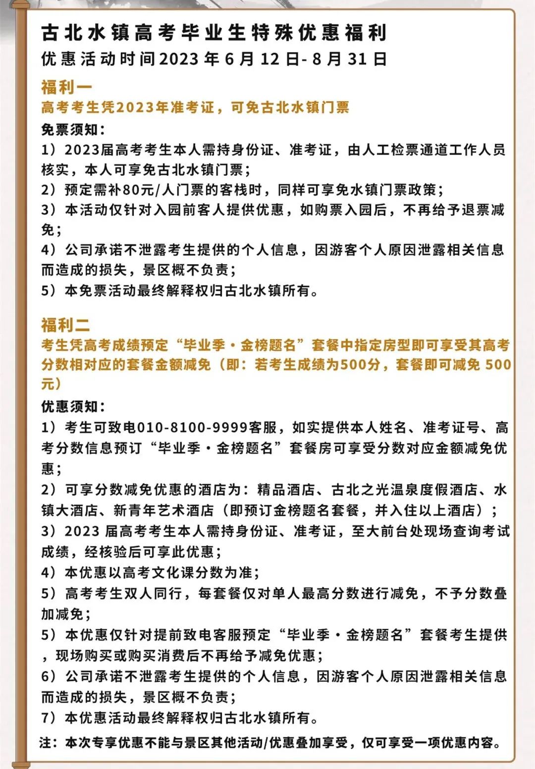 瑶里:6月9日至8月31日,参加2023年全国高考的学生凭准考证和身份证,享受景区免门票政策,景区门票套票内包含景点免费畅玩。