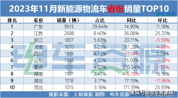 本月新能源物流车畅销省份TOP10排行榜的前三名与上月一致,分别是广东、江苏、浙江三省,广东及江苏两省同比环比实现双增长,广东省销量依旧遥遥领先,占比升至29.64%。
