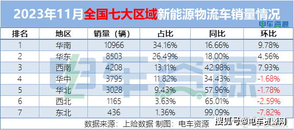 同比来看,东北区域同比涨幅依旧最高,达到99.09%。东北、西北、华北去年基数均较低,今年同比增长数据一直保持高涨,说明北方新能源物流车市场需求在不断提升。