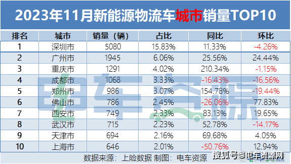 环比增长来看,城市销量TOP10同样也是增长与下降呈现五五分的情况。实现环比增长的城市中,佛山市环比增幅最大,从上月并未上榜,到11月跃居第六,主要得益于长安睿行EM80销量大增。该款车型较10月增加了近100台的增量。