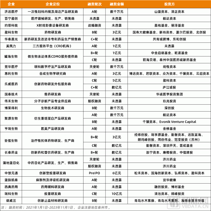 图2. 2021年1月-2023年11月泰州医药领域融资情况(数据来源:动脉橙)