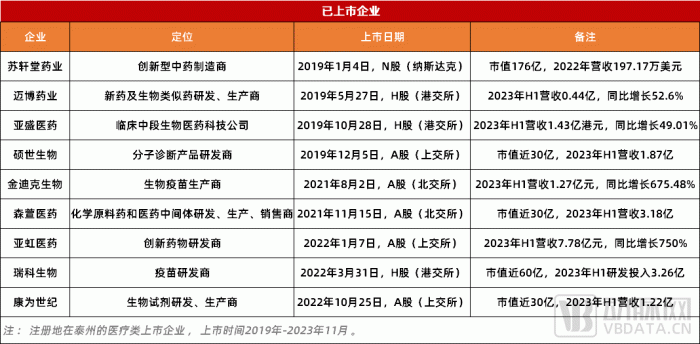 事实上,除了正在排队上市的,泰州近些年还集中涌现了一批已上市医药企业。据动脉网不完全统计,在2019至2022年这一期间,泰州共收获了9家上市医药企业,这其中就包括生物疫苗生产商金迪克生物和创新药物研发商亚虹医药,据悉,两家上市企业均在今年迎来大丰收,上半年业绩增幅近7倍,市场潜力凸显。
