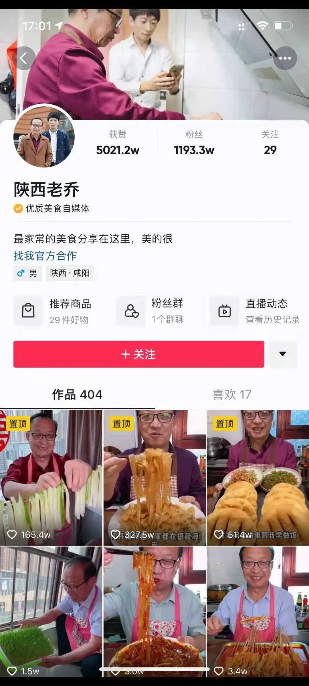 “陕西老乔”乔建忠的成名要比闻士善早。在他入驻抖音前,儿子乔飞已经把自己做饭的视频,分发到各个平台。经过多番测试,父子俩选择以抖音为主战场,很快便收获超1100万粉丝。