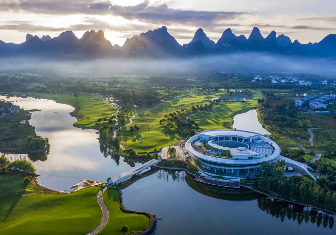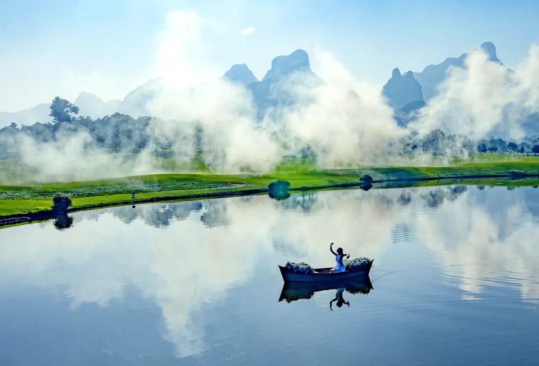 桂海晴岚,三面环山,峰林与湖泊相倒映,被隐藏在桂林郊区里的山水诗情画意,远山如黛,喀斯特地貌赋予了它独特的山水气质。