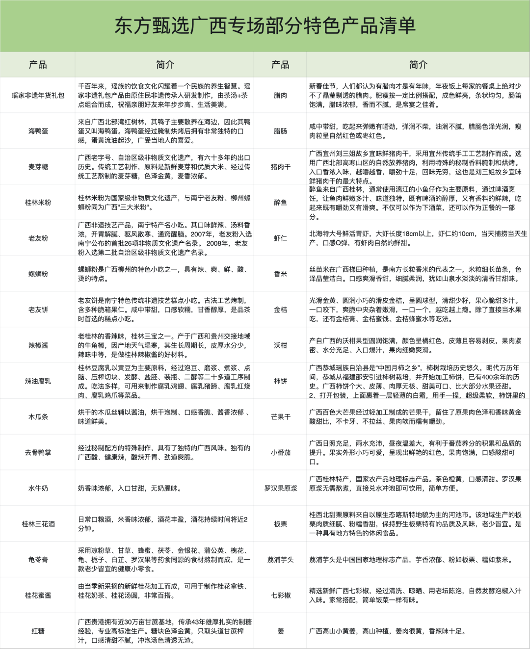 东方甄选团队负责人透露,此次广西专场选品,尤为注重突出广西特色,不仅涵盖全国消费者熟知的广西美食,更力求挖掘广西本地的“隐藏福利”。