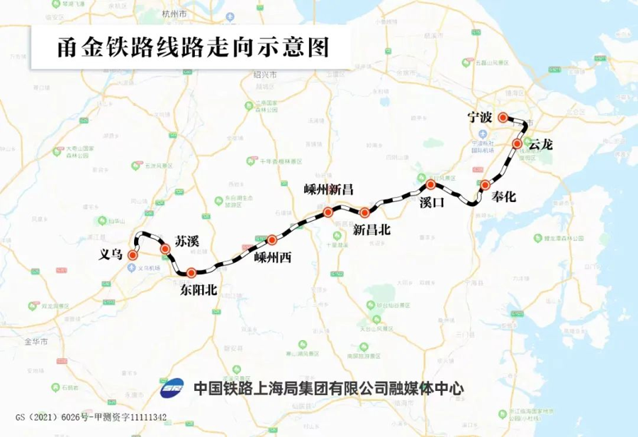 甬金铁路西起沪昆铁路金华站,东至杭甬铁路宁波站,新建线路全长188公里,总投资286.78亿元,全线设奉化、溪口、新昌北、嵊州新昌、东阳北、义乌9座车站,设计时速160公里,是国内首条满足双层高集装箱运输条件的铁路。