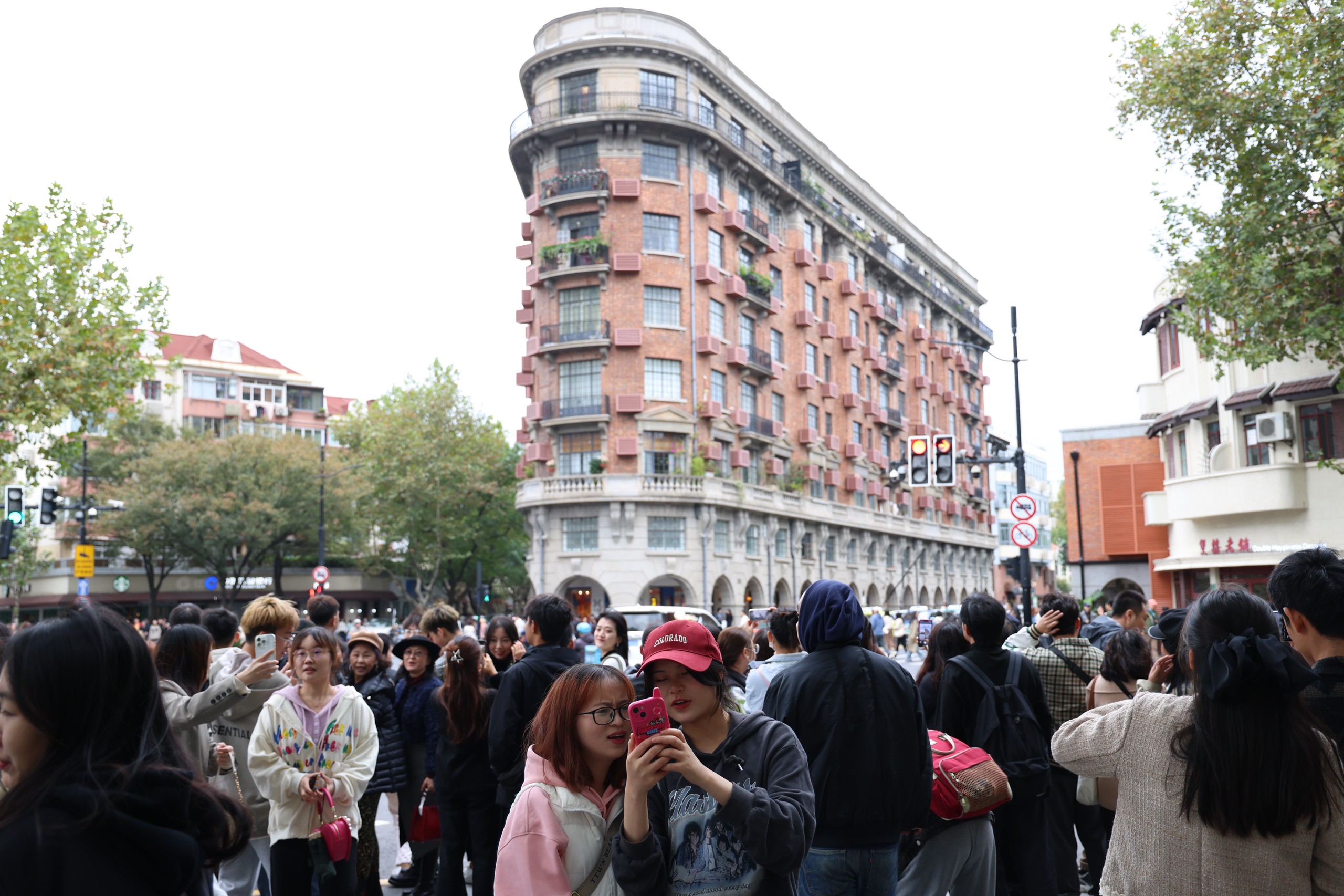上海网红建筑武康大楼所在的那个路口,永远涌着好多游客,因为大楼视角的关系,拍摄者必须要趴到地上,才能拍出全景。