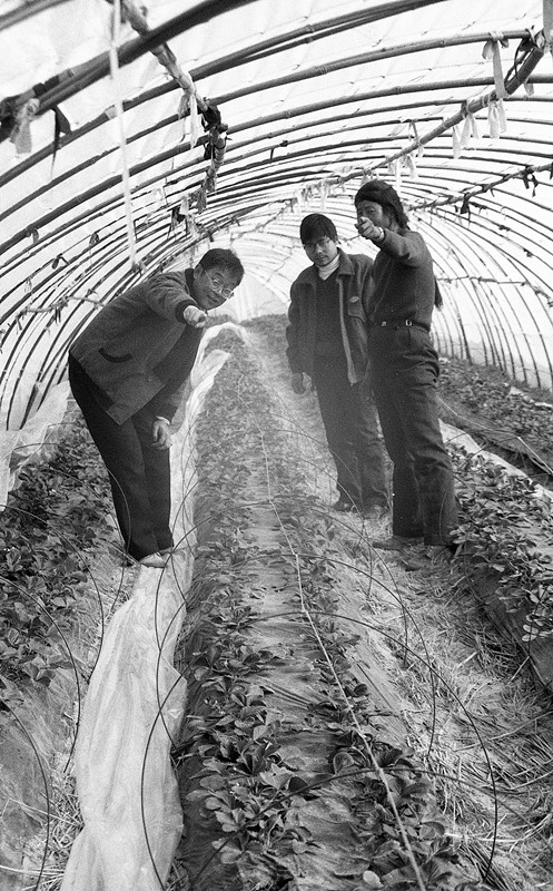 1991年,赵亚夫在白兔指导种草莓(资料图片)