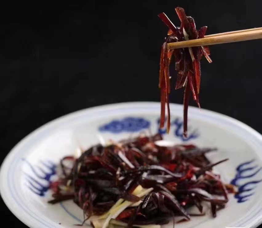 “首先将酱大头切丝,再配以青红椒丝、葱丝,最后点几滴香油,只需几分钟,一道色香味俱全的‘老虎菜’就做成了。”在成武县一家饭馆里,厨师李师傅向记者展示了成武酱菜中被誉为“紫琥珀”酱大头的家庭做法。因简单易做,口感脆爽,这道小菜在成武县居民餐桌上很常见。