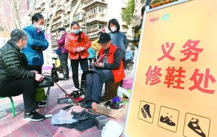 志愿者为社区群众义务修鞋。雷伟东 摄