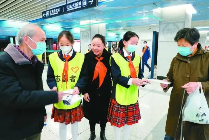 地铁四号线和平门站,碑林区实验小学的学生志愿者将手绘的地铁文明行为宣传卡发放给候车的乘客,倡导文明出行。王旭东 摄