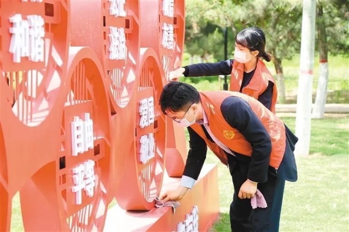 “周末哪里去·一起做公益”志愿服务活动中,西安国际港务区的志愿者在新寺遗址公园打扫环境卫生。王旭东 摄