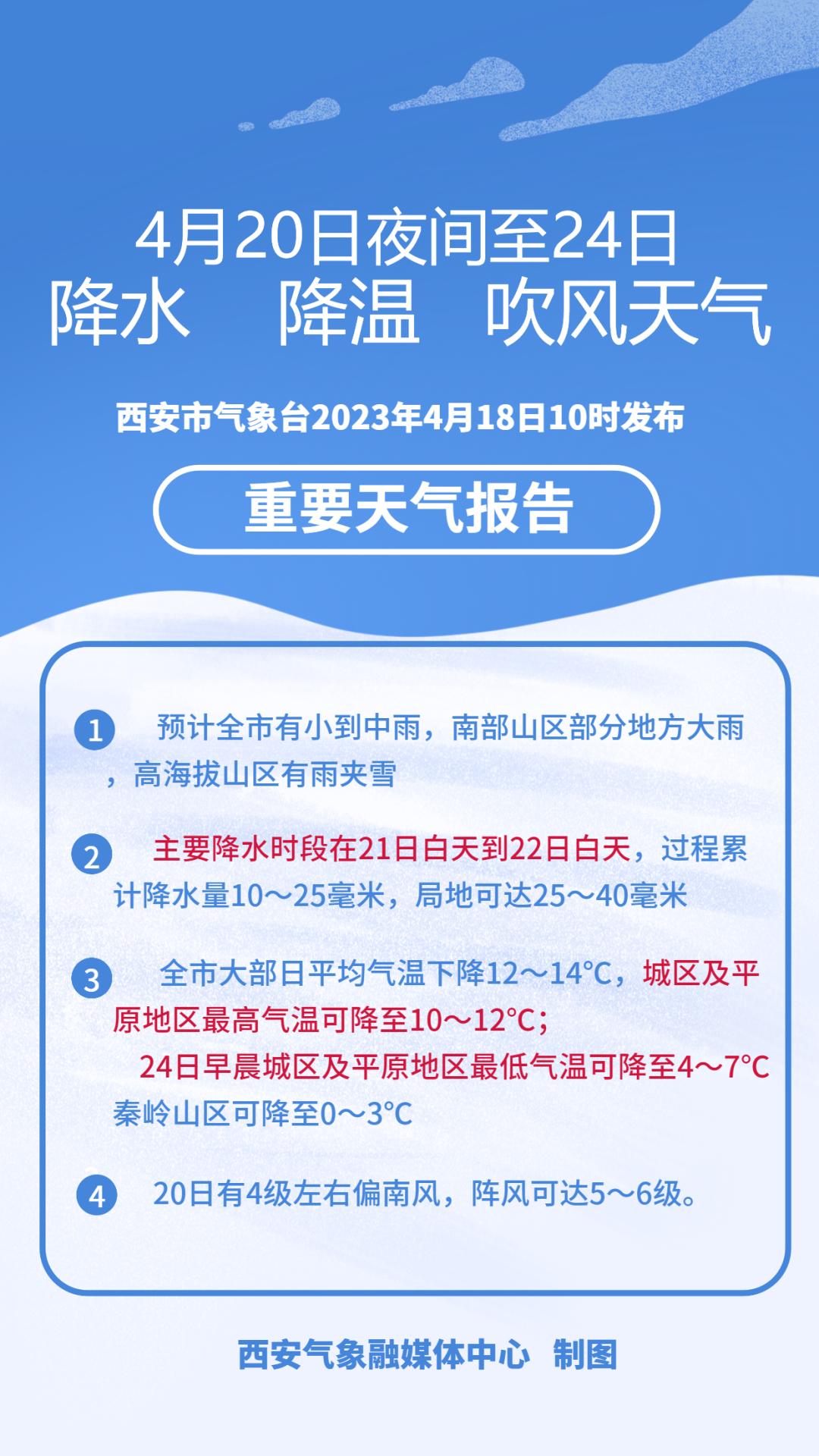 预计全市有小到中雨,南部山区部分地方大雨,高海拔山区有雨夹雪,主要降水时段在21日白天到22日白天,过程累计降水量10~25毫米,局地可达25~40毫米,全市大部日平均气温下降12~14℃,城区及平原地区最高气温可降至10~12℃,24日早晨城区及平原地区最低气温可降至4~7℃,秦岭山区可降至0~3℃,20日有4级左右偏南风,阵风可达5~6级。