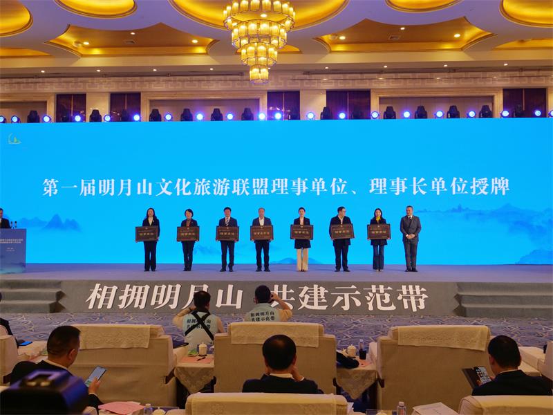 四川新闻网-首屏新闻广安12月28日讯(记者 游伍琼 摄影报道)12月27日,共建明月山绿色发展示范带党政联席会第六次会议在广安市邻水县举行,会上宣布明月山文化旅游联盟正式成立并举行授牌仪式。