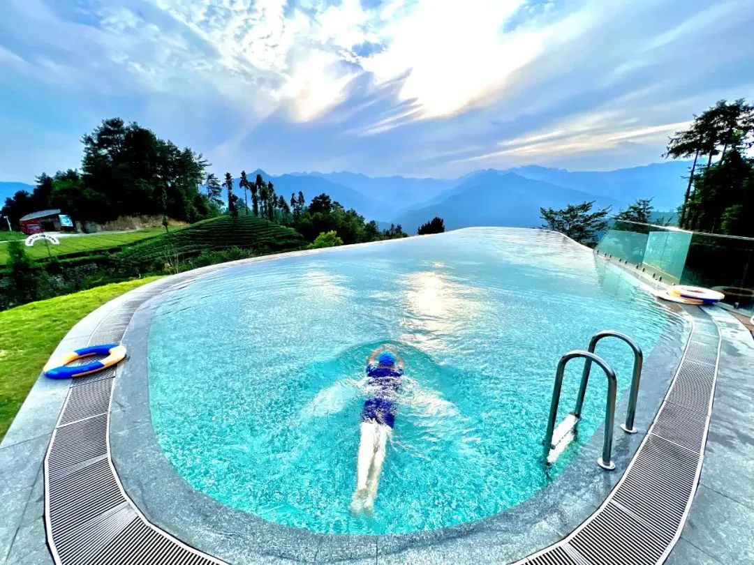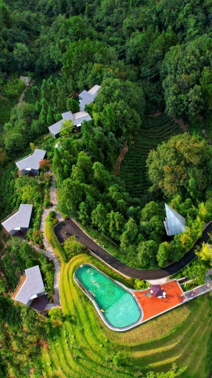 有几分逃离,又恰在人间!这里有飘着茶香的梯田,也有田间劳作的乡民。这里传统,这里现代。极具设计感的独立空间,错落排开。无边泳池仿佛天池,流线感的美学建筑,静静躺在大地。