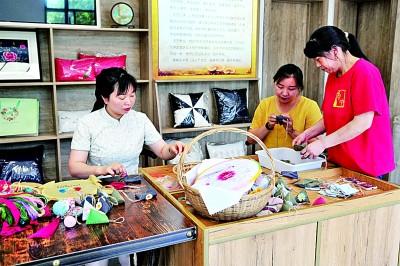 许家冲依托沿江依坝优势发展特色民俗产业,以特色产业带动创业就业。宜昌沁邑民俗文化产业发展有限公司副总经理朱雪梅告诉调研组,公司注册“峡江绣女”商标、发展手工刺绣产品、建立牵花绣传习所,培养出非遗传承人6名,培训具有合格牵花绣技艺的坝区移民妇女近800人,使本地传统民间手工艺牵花绣得到传承。