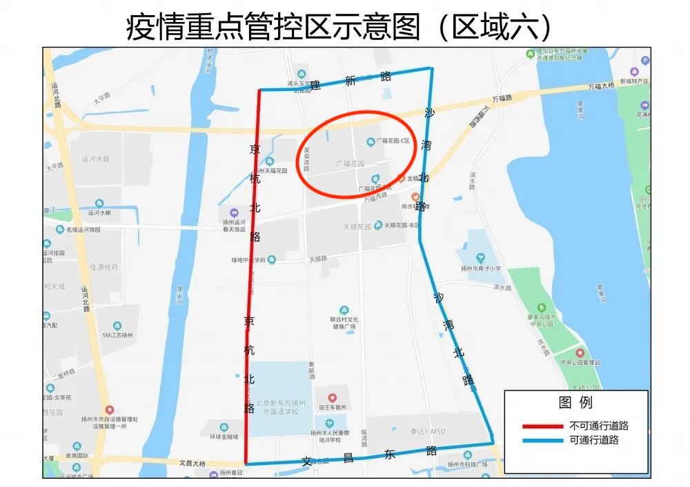 疫情重点管控区示意图(区域六),红圈标识位置即为广陵区湾头镇广福花园小区。图片来自“扬州发布”微信公众号