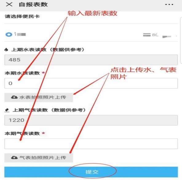自报表数页面会显示上期燃气表和水表的历史指针数,手动输入最新的燃气表和水表读数(必填),并将水表和燃气表的表数拍照上传(可选)后点击提交(图示3)