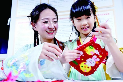 浙江省杭州市上城区丁兰街道五会港社区,社区工作者和小朋友一起制作中秋福袋。周方玲摄/光明图片