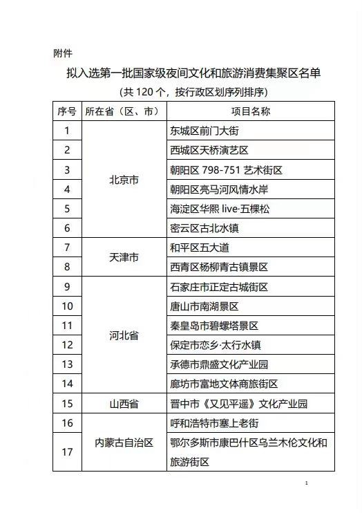10月19日,文化和旅游部发布关于第一批国家级夜间文化和旅游消费集聚区名单的公示,经地方申报、省厅推荐、合规性审查、专家评审、舆情风控、实地考察等方式,拟确定北京市东城区前门大街、上海外滩等120个项目为第一批国家级夜间文化和旅游消费集聚区。