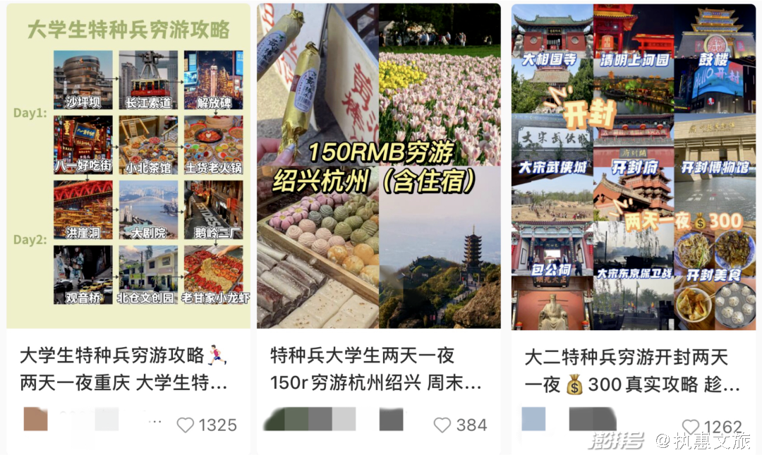 为了节约成本,他们一般选择周五晚上出发,打卡各大景点后,在周一早上赶回教室上课。像《咬文嚼字》中解释的特种兵旅游那样,用最少的时间,花最少的费用,游览最多的景点,在旅游目的地了解最多的历史文化、风土人情,像在执行特殊任务。