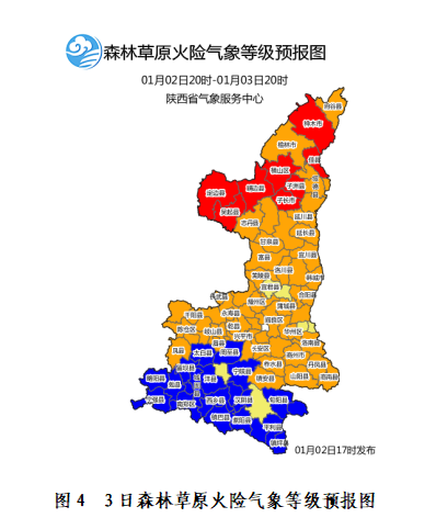 预计今天白天:全省晴天间多云。陕北有4级左右偏南风。今天晚上:陕北、关中、陕南东部晴天间多云,陕南西部多云间阴天。汉中西部局地有小雨或雨夹雪。陕北有4级左右偏北风。日平均气温陕北北部下降2~4℃。今日陕北、关中、陕南东部等地森林草原火险气象等级为4~5级(高度~极高危险)(图4),需加强防范。