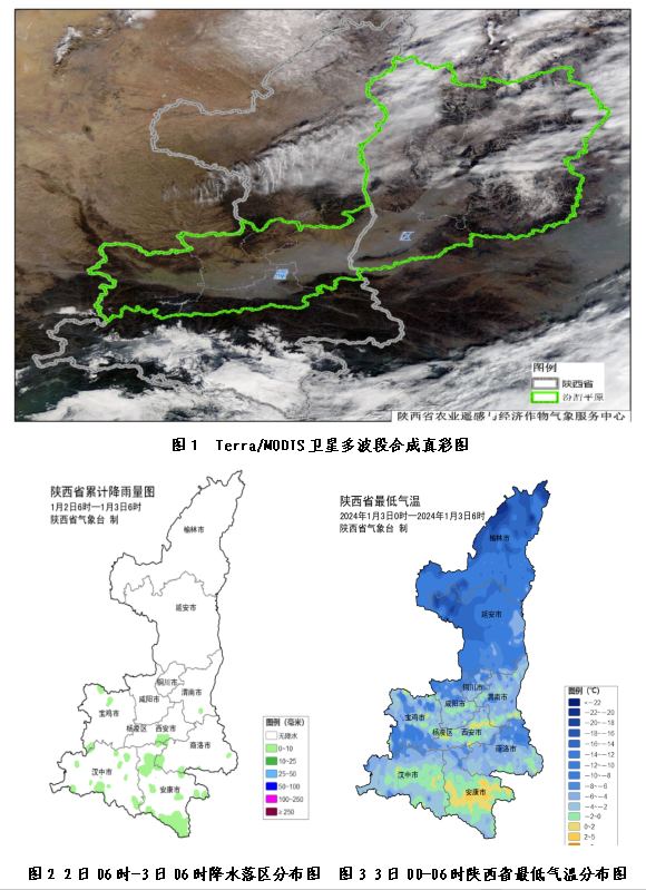 昨日我省大部以晴到多云天气为主,关中中东部出现轻度霾,中南部局地出现弱降水。2日12时30分,气象卫星监测显示:汾渭平原出现轻度霾天气(图1),其中霾区主要分布于陕西省西安北部、咸阳南部、渭南大部,山西省运城大部、临汾南部。2日06时—3日06时全省共有31个区县142个监测站出现降水(图2),最大镇坪县防汛办8.6毫米。昨日全省最高气温1℃~16℃,最高商南16.4℃,西安站14.8℃,其中陕北南部最高气温较前一日上升0.2~3℃,关中、陕南最高气温上升2~8℃,升幅最大佛坪8.1℃。今晨(截至06时)陕北北部、关中南部和陕南大部最低气温较昨晨下降2~6℃,全省共90个区县1902监测站最低气温低于0℃,最低气温分布:陕北-22~-2℃,最低神木市红碱淖站-22.3℃;关中-14~4℃,最低千阳高崖站-14.0℃,西安站0.1℃;陕南-12~5℃,最低留坝宽沟站-11.8℃(图3)。昨日至今晨榆林中西部、关中北部、商洛北部等地共30个区县77站出现7级及以上阵风,其中佛坪、商州、洛南、定边局地阵风风力达8级,柞水、镇安局地阵风风力达9级,最高柞水牛背梁景区站23.5米/秒(9级)。今晨紫阳、石泉、西乡、城固、汉阴、洋县出现强浓雾,平利出现浓雾。