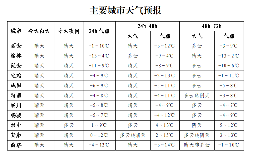 4日:陕北、关中、陕南东部晴天间多云,陕南西部多云间阴天。巴山部分地方有小雨或雨夹雪。陕北有4级左右偏北风。日平均气温陕北北部下降4℃左右。5日:陕北、关中多云间晴天,陕南多云间阴天。秦岭山区西段有小雪或雨夹雪,巴山地区有小雨或雨夹雪。6日:陕北、关中晴天间多云,陕南多云转阴天。陕北、关中北部和商洛有6级左右偏北风。7日:陕北、关中多云间晴天,陕南阴天转多云。8日:全省晴天间多云。陕北北部有5~6级偏北风。9日:全省多云间晴天。10日:全省多云转阴天,陕南南部局地有小雨(雪)。陕北部分地方有5~6级偏北风。11日:全省阴天转多云,陕北北部局地、关中南部局地和陕南东部有小雪。陕北、关中和商洛有6级左右偏北风,日平均气温陕北下降6~8℃、关中、商洛下降4~6℃。12日:全省多云间晴天。后期天气趋势(13-16日):陕北、关中以晴天为主,陕南以多云天气为主。