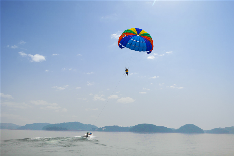 庐山西海风景名胜区位于九江市,已建成面积495平方千米,坚持“健康、运动、休闲”发展主题,坚持“体育搭台、旅游唱戏”融合发展理念,坚持“空中看西海、水上玩西海、水下探西海、陆上竞西海,户外运动、山水联动 ”立体开发布局,目前已建设庐山西海舰队运动休闲中心、瑶池湾国际垂钓中心、庐山西海温泉飞碟射击训练基地、中海运动休闲度假区、庐山西海漂流等体育旅游融合项目,以及花千谷滑草场、大峡谷索道车、全民健身场地等配套设施。引进了花样滑水、皮划艇、帆船、摩托艇、水上降落伞、水上飞机、碧波冲浪、游湖玩岛等水上游乐项目,并积极开展相关水上赛事活动;经营了漂流、登山、溜索、索道车、迷你卡丁车、滑草等户外运动项目,依托环湖旅游公路和体育运动设施,每年固定开展帆船、摩托艇、网球、乒乓球、羽毛球等国内国际赛事活动。