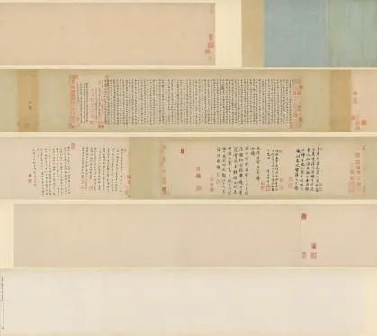 引首31.8×123.8cm;书心27.5×118.5cm;题跋一27.5×104cm;题跋二32×106cm