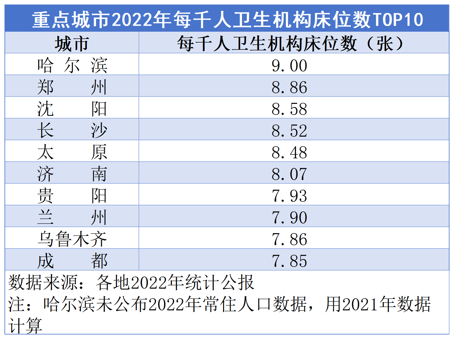 值得一提的是,相比经济发达的东部地区,中西部地区和东北地区城市在每千人卫生机构床位数指标上表现更为突出。排名前十的城市中,哈尔滨、沈阳两座东北城市位居第1、3位;郑州、长沙、太原、贵阳、兰州、乌鲁木齐、成都均为中西部城市,占据7席。