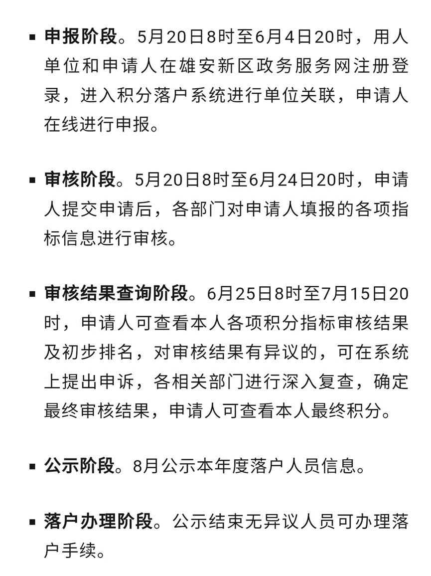 昨日,雄安新区2023年积分落户申报工作正式启动,本次申报工作分为五个阶段。