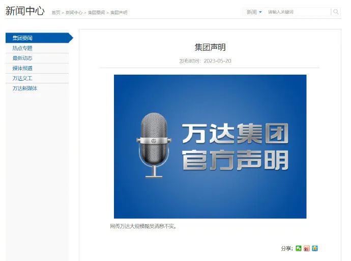 5月20日,万达集团官网发布官方声明:网传万达大规模裁员消息不实。此前,有报道显示,有接近万达集团的人士称,6月前集团将开启大规模裁员,以降低人员成本。万达系也同时通过质押融资、减持套现等方式四处“扑钱”。