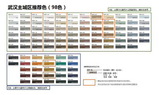 规划项目组表示,武汉市的城市特质可以归纳为五大方面:大江大湖的自然特征、多元文化的民俗特征、见证历史的风貌特征、三镇鼎立的功能特征、现代建设的趋势特征。滨湖特色是武汉最显著的城市特色,暖白和亮灰作为背景色,能更好地映衬出武汉的自然山水禀赋。结合楚民居的风格和租界区等特色建筑,又将橙色列入主色调。为兼顾共性和个性,项目组又在国际标准的万种色系中甄选了98色,作为武汉中心城区推荐色。