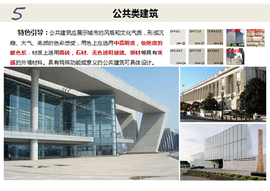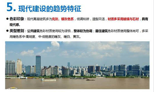 武汉市现状建筑色彩以砖橙、砖红、暖灰、暖白等暖色调为主。材质以天然石材、烧砖、涂料及烧瓦为主,现代金属及玻璃应用趋势也较为明显。
