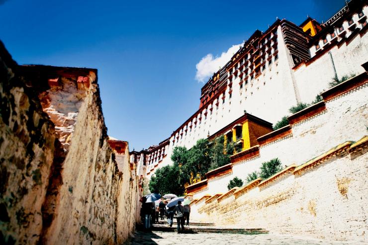 地处高原的拉萨光照异常强烈,天空明亮湛蓝,建筑有清晰的明暗交界,红与白是建筑的主色调。布达拉宫以及众多城堡寺庙多建在山上,以蓝天白云为背景,其强烈纯净,对比鲜明的色彩让人过目难忘(下图 摄影/Merten Snijders)。