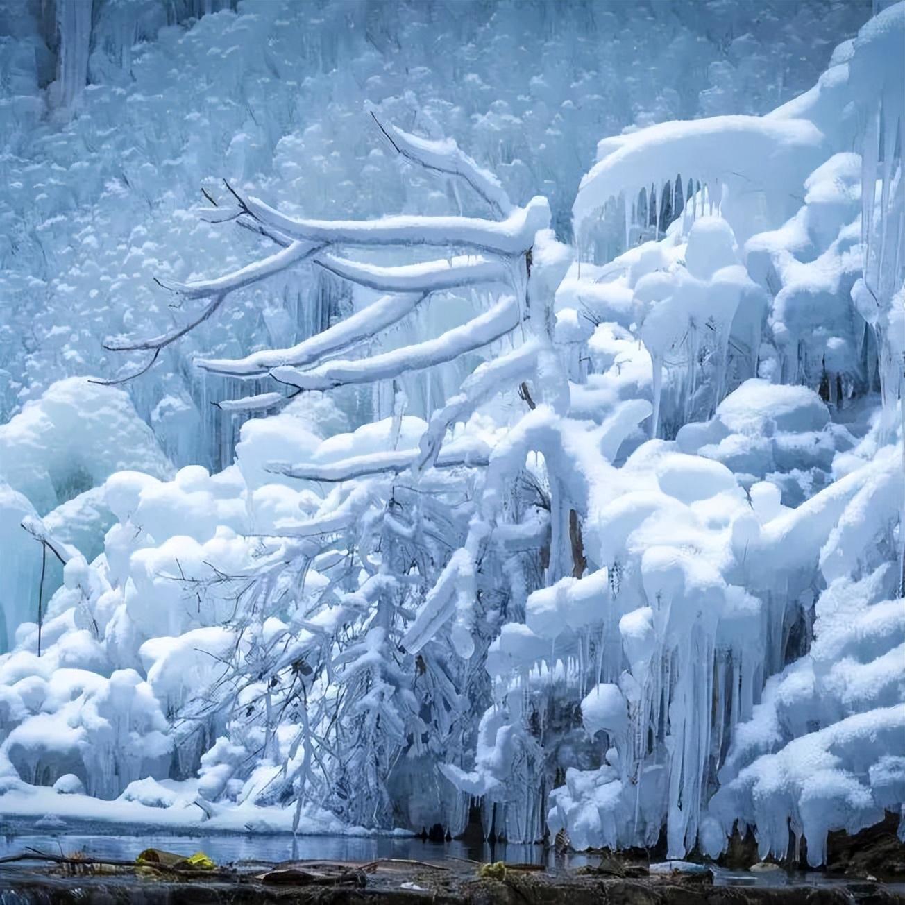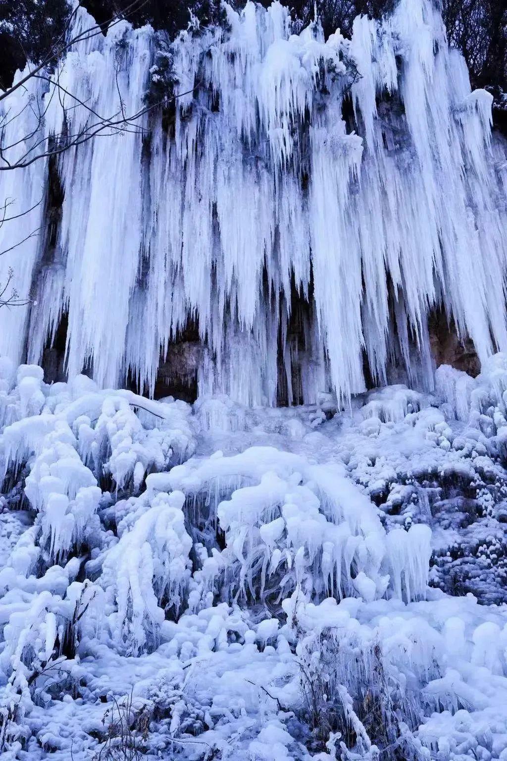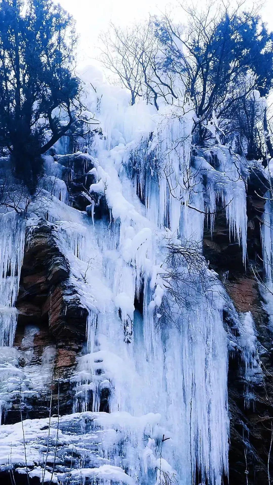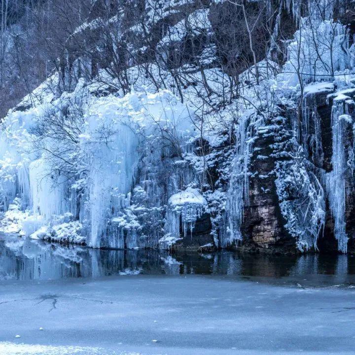 九如山的雪景值得一看,是无需滤镜的美丽和令人震撼的壮观!在九如山内,面朝冰瀑,眼前是白茫茫的一片,山间的冰层层叠叠,冰挂与冰挂相互勾连。
