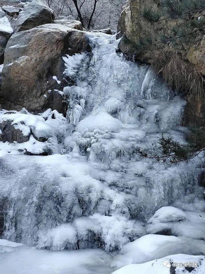 彩石溪内漫山冰瀑晶莹剔透、玉树菱花、冰挂群集。凝霜挂雪,花草树木被装裹成玉树琼枝,宛若一幅立体的水墨画卷。