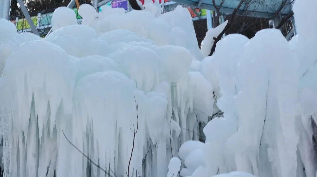 流水不再流动,变成冰雪,凝固了时间。彩石溪的潺潺流水凝结成洁白的“玉带”,在山间舞动,美丽至极。