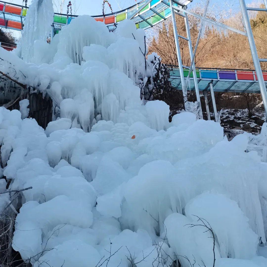 美景自然成,天然去雕琢。入冬后,这里就形成了壮观的冰瀑,银装素裹,冰柱如玉、冰花如钻,层层叠叠地悬挂在石壁间。