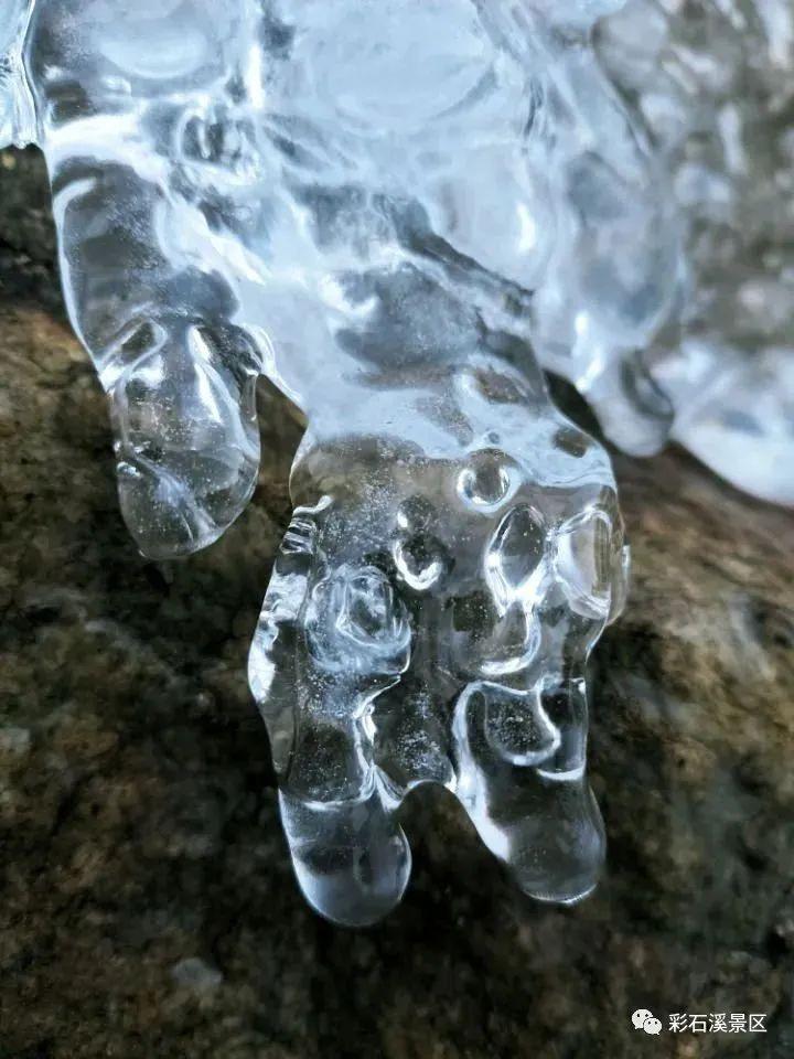 彩石溪的岩石散布山涧,溪流冲击石块,磨平了棱角、雕琢出了形状。冬季的冰瀑正是分布于这样的岩石之间,依山势而成,仔细看,冰雪上有细细的纹路,细细触摸,与岩石上的不同,仿佛在述说它和岩石的故事。