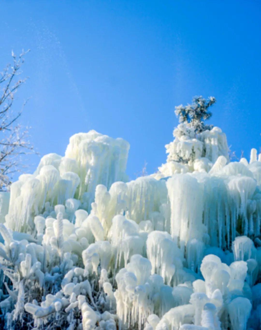 它们犹如冰雪铺就的冰域森林,无比华丽。冰瀑高悬,如帘如柱,如花似玉,千奇百态。举头望去,枝丫上满是雾凇,让人仿佛来到童话里的冰雪王国;俯瞰脚下,似海底珊瑚般晶莹剔透,让人情不自禁为之倾心。