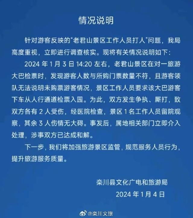 1月4日晚,针对游客反映的“老君山景区工作人员打人"问题,栾川县文化广电和旅游局发布情况说明如下: