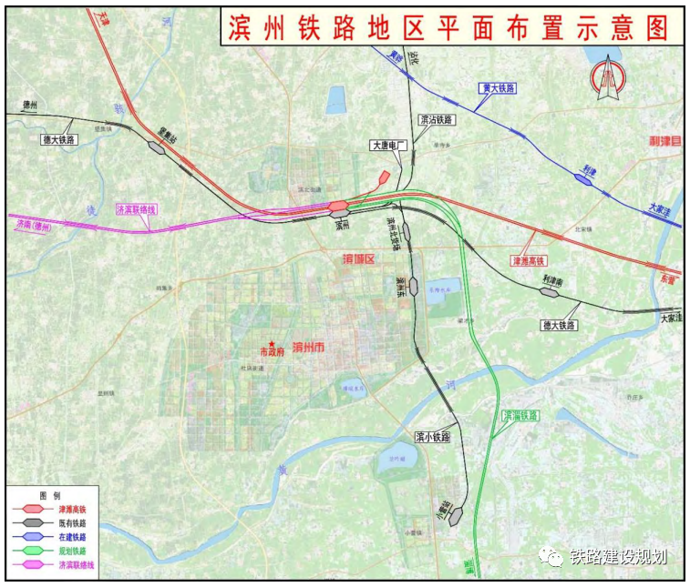 天津至潍坊高速铁路自城市西北侧引入滨州地区滨州站;津潍高铁济南至滨州联络线自济南东客站引出,自城市西侧引入滨州地区滨州站;规划滨州至淄博城际铁路自地区东南侧引入。