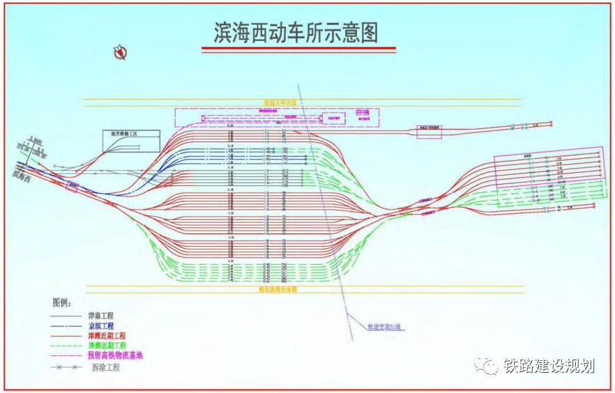 津潍铁路引入天津枢纽,接轨站为滨海站,枢纽内主要客运站为滨海西站,枢纽内既有津秦滨海西存车场改扩建为滨海西动车所。